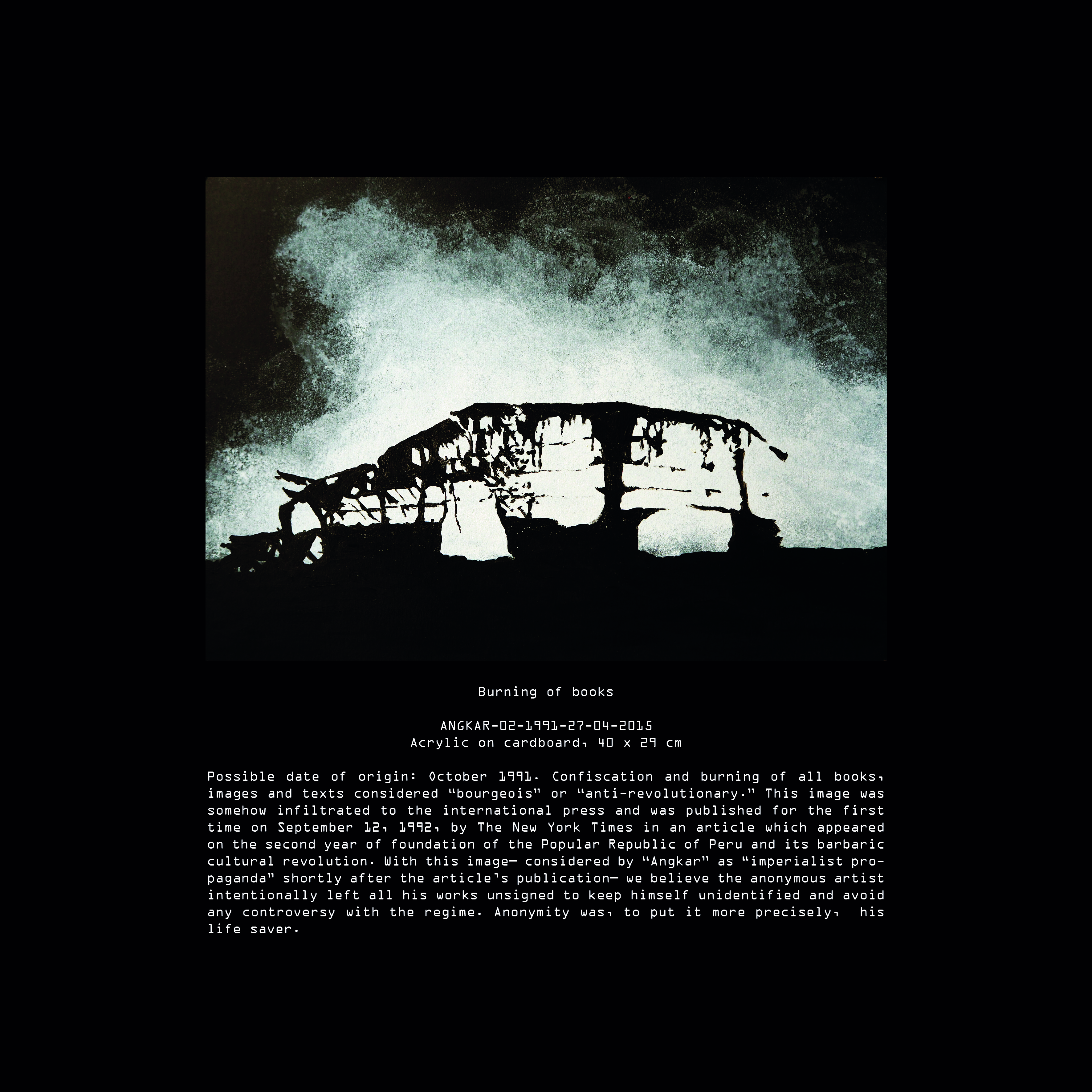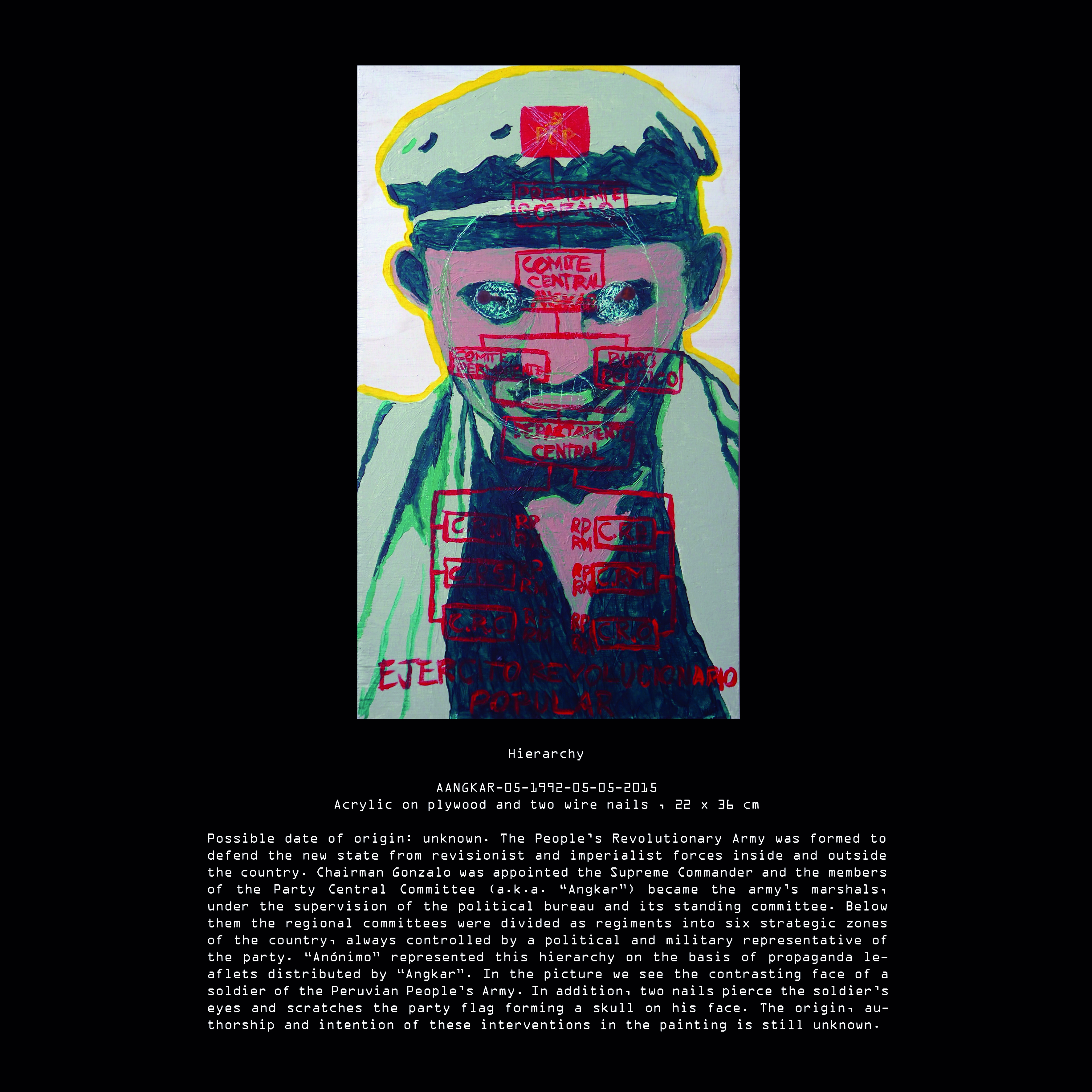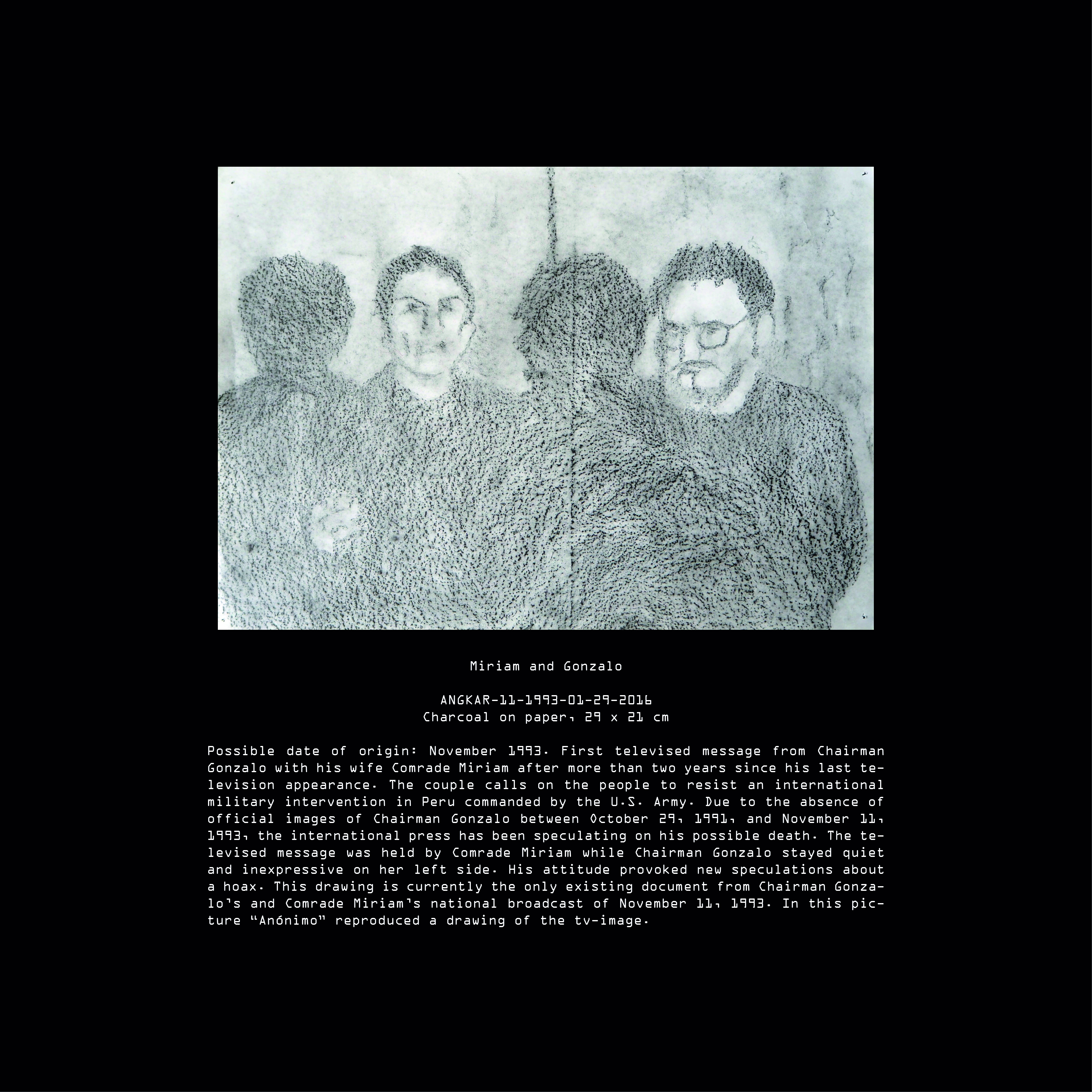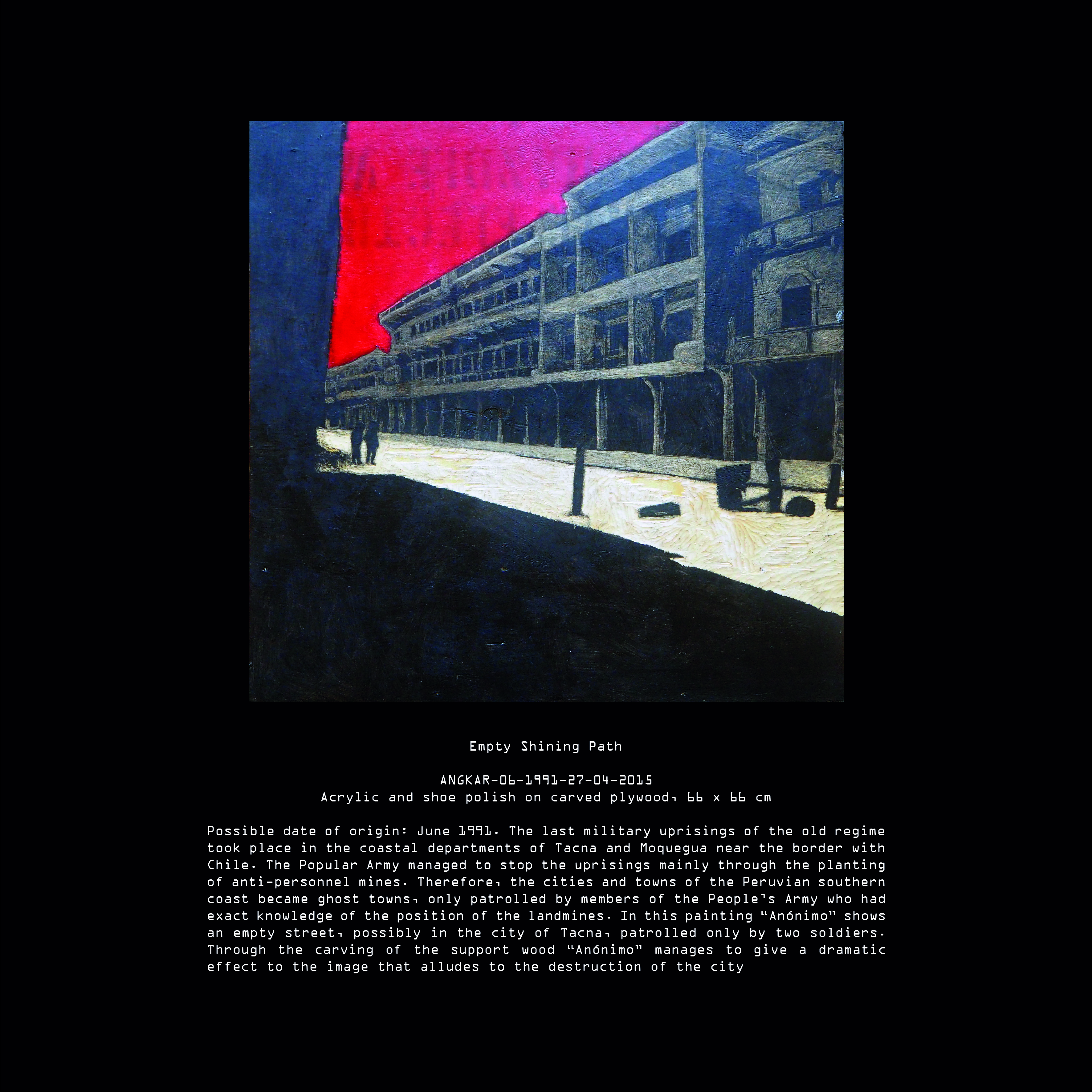 Today, after many years of research we have been able to elucidate many aspects of “Anónimo’s” life during the Peruvian Angkar. It is still difficult for us to establish one single authorship in some of the pieces contained in our archive. Although, all pieces can give us at least some hints about the artist’s life. These hints come to an abrupt end with his final disappearance during the international military intervention in Peru on Saturday, 19th of February, 1994.
