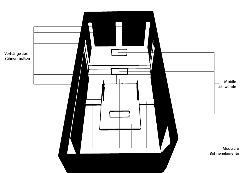 The entire CULTRA hall (Hall 1 and 2) is set up in a multifunctional media stage concept. The stage offers different variations for different event formats and can be used for events with an audience on site as well as for live streaming events. The concept focuses particularly on the potential of live broadcasting of events. Curtains of green stage molleton are designed resembling a green box, so that, stretched along the walls of the hall, they can easily create a television studio. This expands the audiovisual possibilities of real-time digital processing as well as post-production of stage sets, backdrops and spatial backgrounds for streaming. And with the placement of curtains of black stage molleton that can be stretched in front of the green curtains, the space can transform back into a conventional theater when a live event with an audience in the auditorium requires it. In addition, some modular stage elements have been co-designed, which offers another possibility of the hall as a whole stage for musicals, galas, dance events and theatrical performances. In the center of the room a smaller stage can be built, which is connected to the main stage and the rest of the hall by corridors through joined stage floor elements. These corridors can also mark the areas where the audience will be placed when the whole hall is used as a stage. In addition, there are mobile screens that can be conveniently and quickly hung and unhung as projection screens.