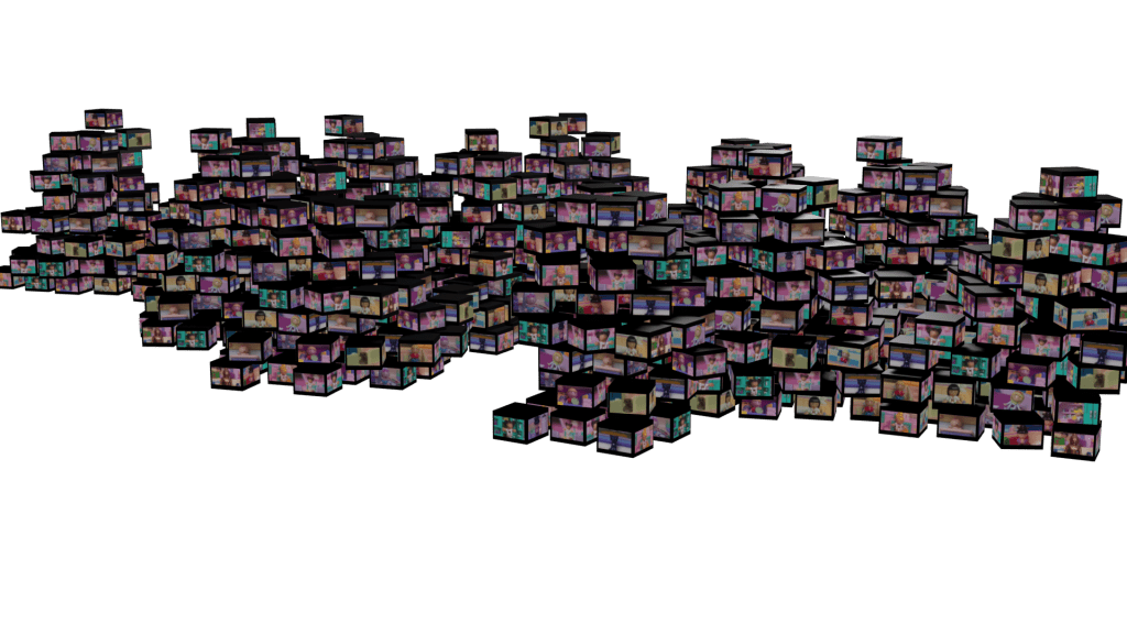 On the screen Buddha is sitting in front of us, waiting to start a conversation. Slowly we see more screens on which other characters are facing us in the same way. Zooming out constantly, we slowly recognize a whole chaotic structure with many screens showing the faces of different characters trying to start a conversation. Conceived as a modular, site-specific video projection, the work is a critique of an overly optimistic, libertarian view of the digital future and the invisibility of its social and environmental impact on millions of people around the world who are not considered part of the digital turn.